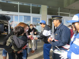 地元スーパーマーケットでの啓発活動では、南安曇農業高校生が育てた文字入りりんご「南農リンゴ」を」生徒さんと一緒に配布しました。