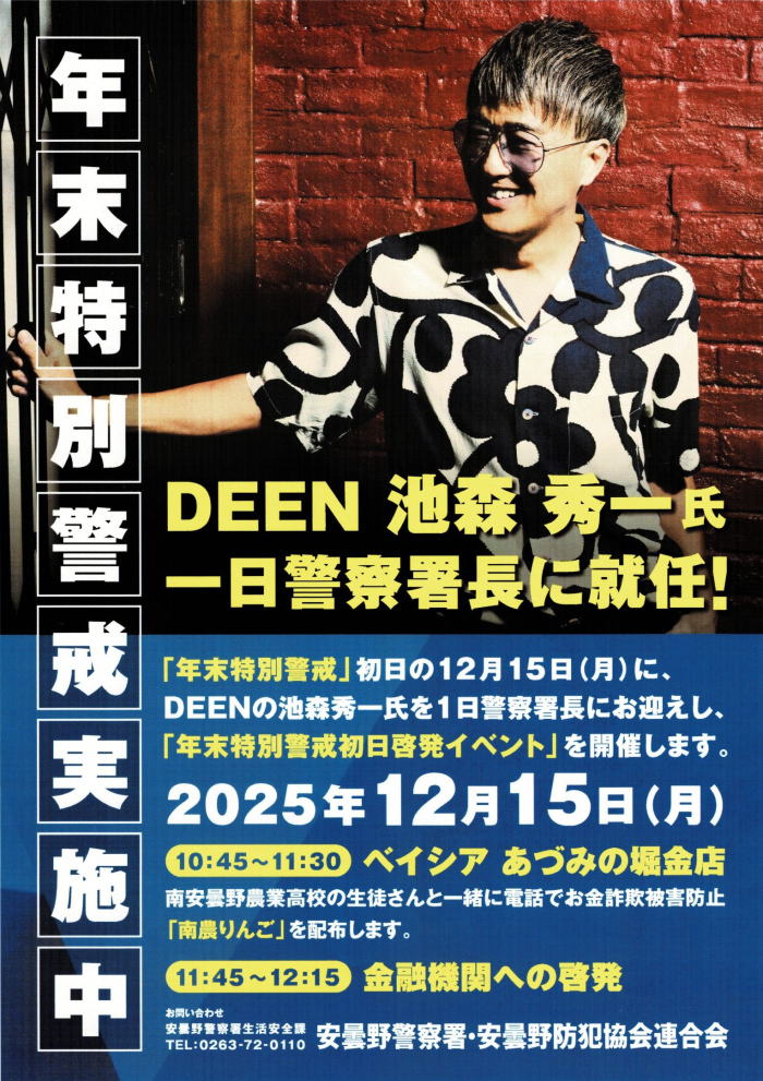 安曇野警察署では年末特別警戒初日の12月15日(月)、DEENの池森秀一氏を一日警察署長にお迎えし、年末特別警戒初日啓発を行います。